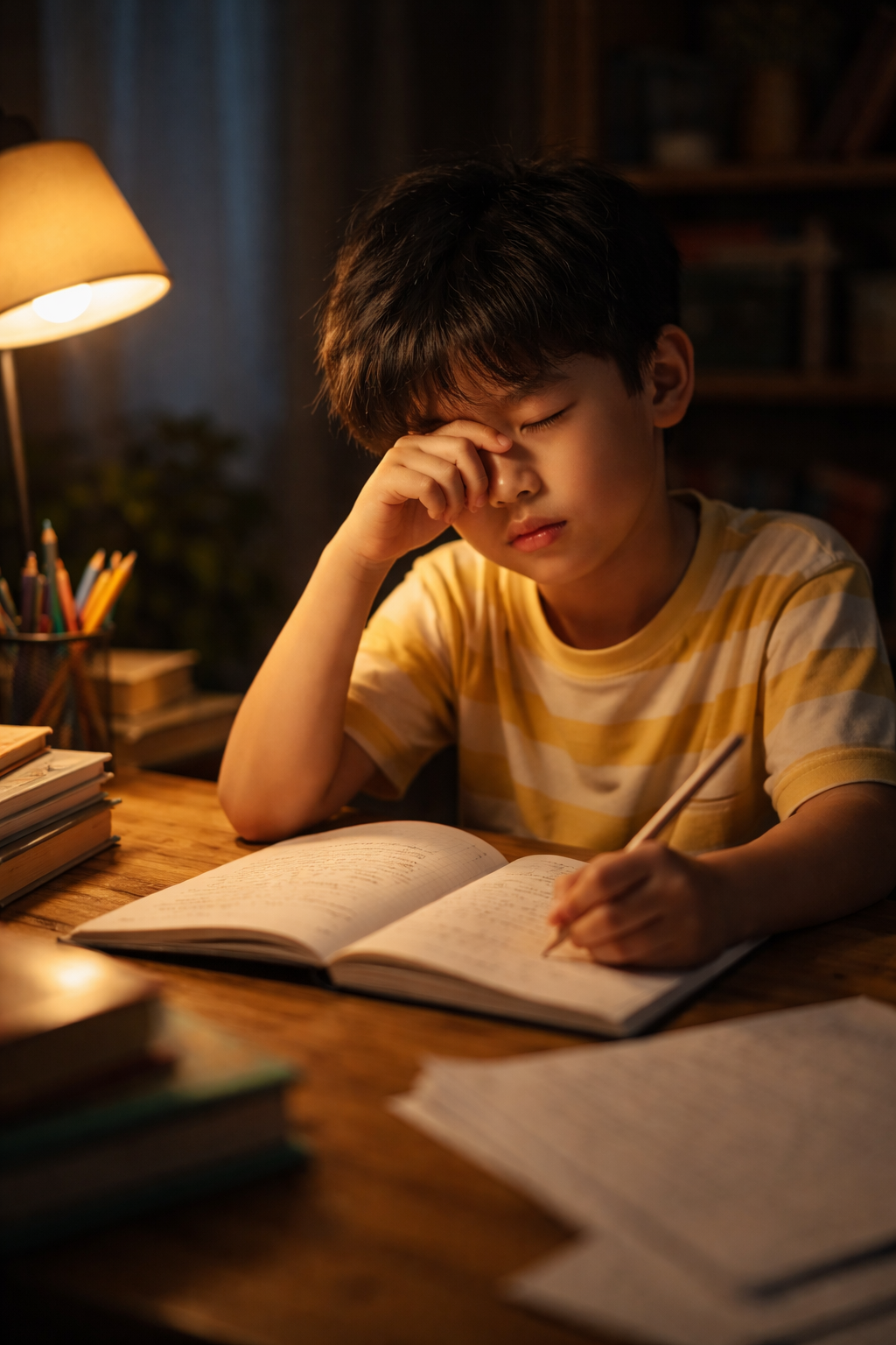 Dụi mắt liên tụcKêu mỏi mắt, cay mắt chỉ sau 20–30 phút học bài.