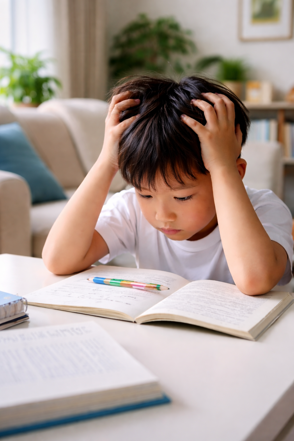 Cúi sát vào vởKhoảng cách mắt sách quá gần, dấu hiệu điển hình của cận đang tăng.