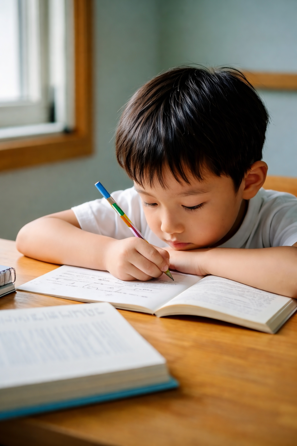 Cúi sát vào vởKhoảng cách mắt sách quá gần, dấu hiệu điển hình của cận đang tăng.
